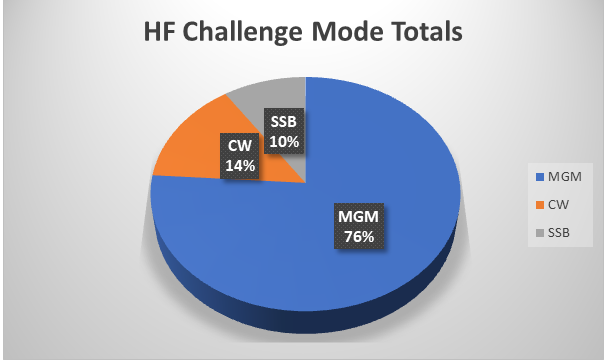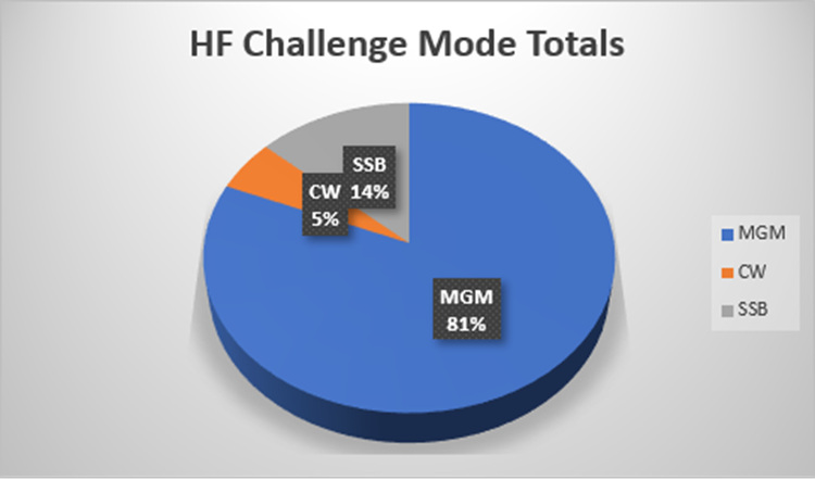 The 2024 HF Challenge saw a slight drop in the number of DXCC being worked but quite a big increase in the amount of QSOs being made, this year a total of 50,916 Qs were made and out of those 41,370 was using MGM, 2,730 using CW and 6,816 using SSB. Compared to last year MGM and SSB was up and CW had dropped. Still some good DX worked in all of the modes.